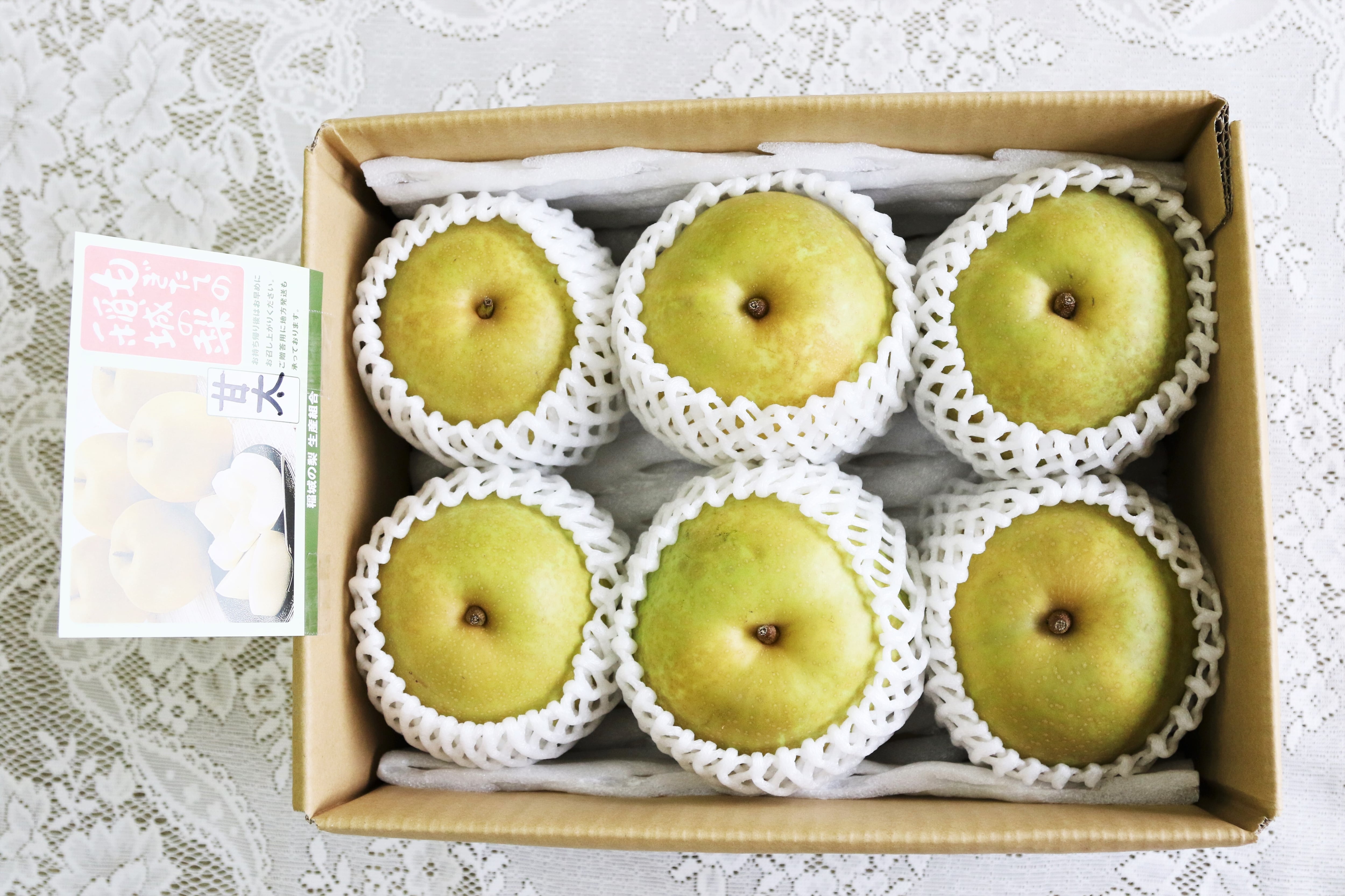 ◆中玉6個入前後。全国で売られていた日本梨にはない風味、果汁多く、甘く食味良好。